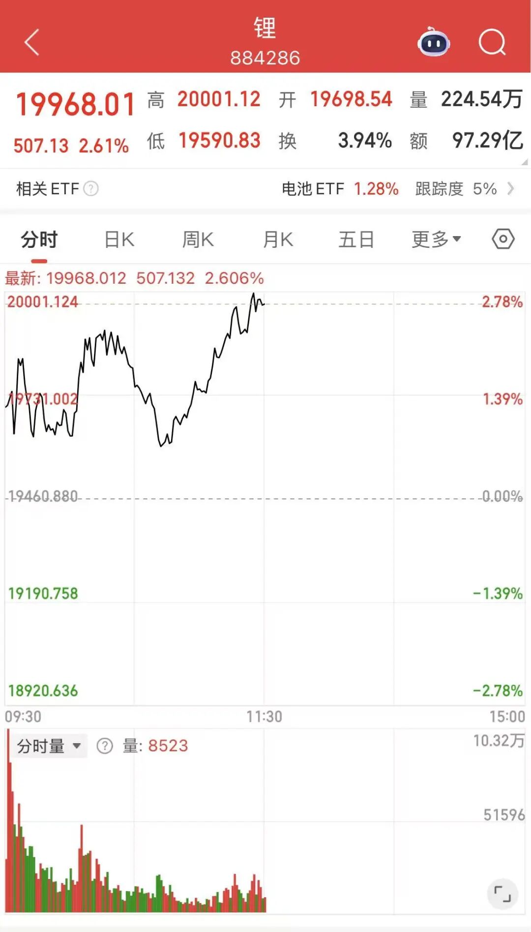 12月22日早盘,碳酸锂主力合约盘中大涨,一度站上116460元/吨的高位,创下该合约年内最高价,截至午间收盘,涨5.16%。澎湃新闻(300033)锂板块涨近3%,天齐锂业(002466)、盛新锂能(002240)、融捷股份(002192)涨幅居前。